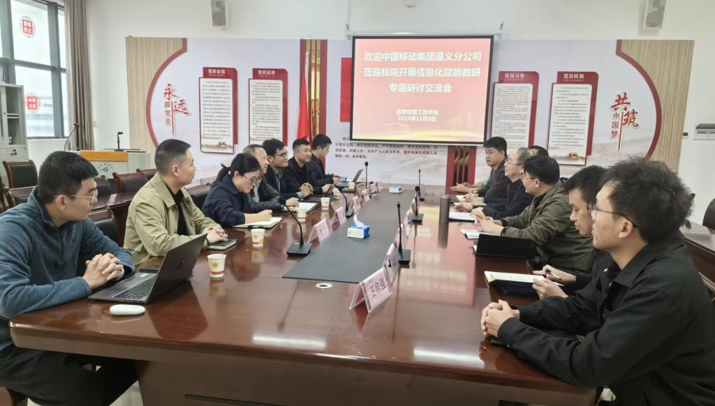 周帮炜总经理提出,学院可以与遵义移动公司围绕地方特色产业的信息化、智能化升级改造开展深度合作,共同申报科研课题,推动科技成果转化。冯胜勇总经理提出,学院可通过共建实验室、共享研究平台等方式提升产学研协同创新效率。苟松副总经理简要介绍了公司研发队伍,以及公司近年来实施的智慧农田、酱酒园区、智慧旅游等信息化项目和应用情况。