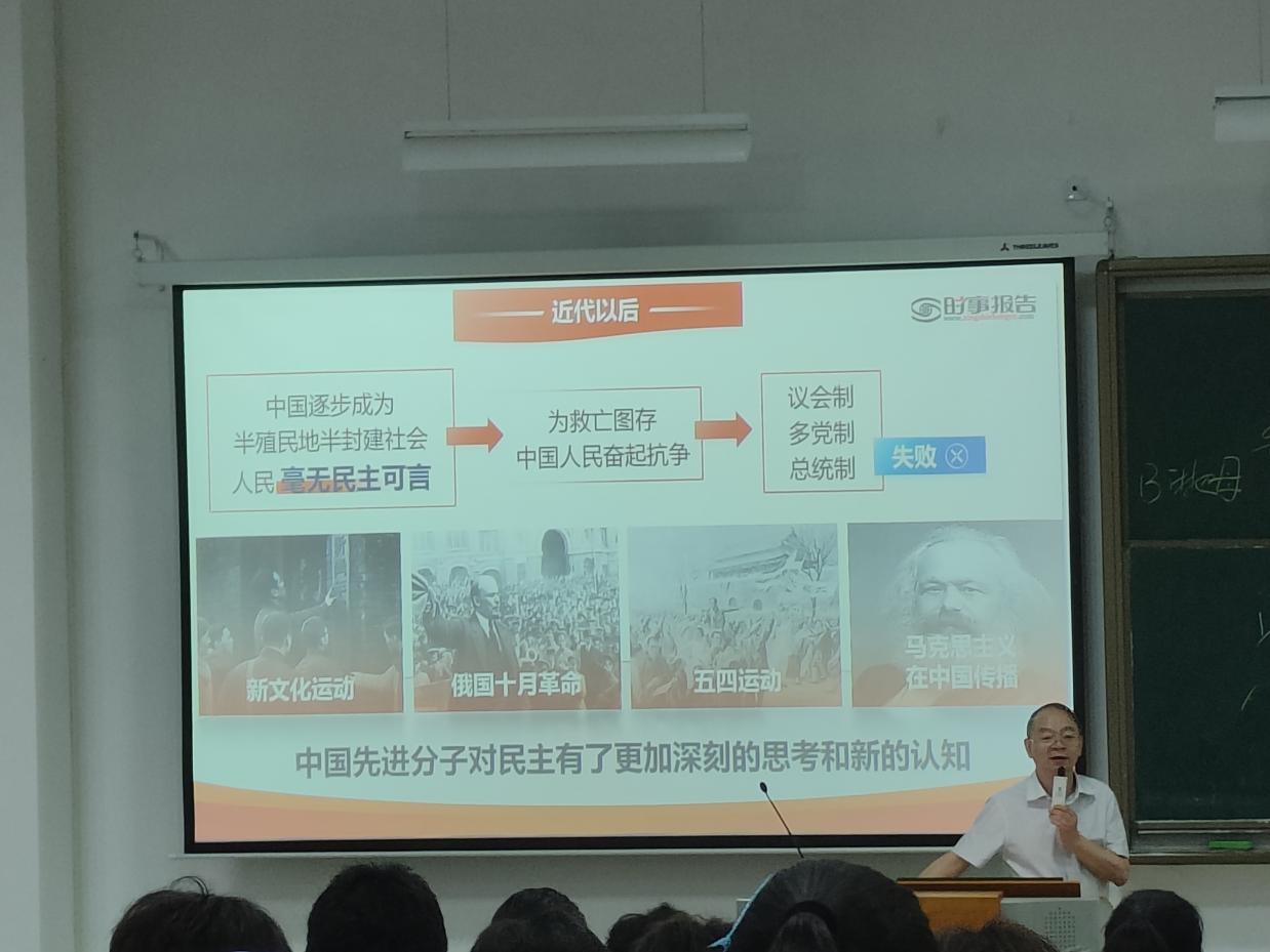 李岩书记从越走越宽的民主之路、科学有效的制度安排、彰显优势的民主模式以及可资借鉴的民主典范四个方面,带领学生全面认识了全过程人民民主的发展历程、制度安排、制度优势以及为什么人民民主是值得世界参考的民主模式。他通过生动的案例和丰富的数据,阐释了好的民主制度必须能够最大限度反映民意的真理。最后李书记讲解到中国发展民主,就要走符合国情的民主发展道路,要始终立足基本国情把发展作为第一要务,从中华优秀传统文化中汲取智慧和养分。我们要准确把握中国所处的历史阶段,积极稳妥、稳中求进,并坚持问题为导向,推动民主制度体系更加成熟。