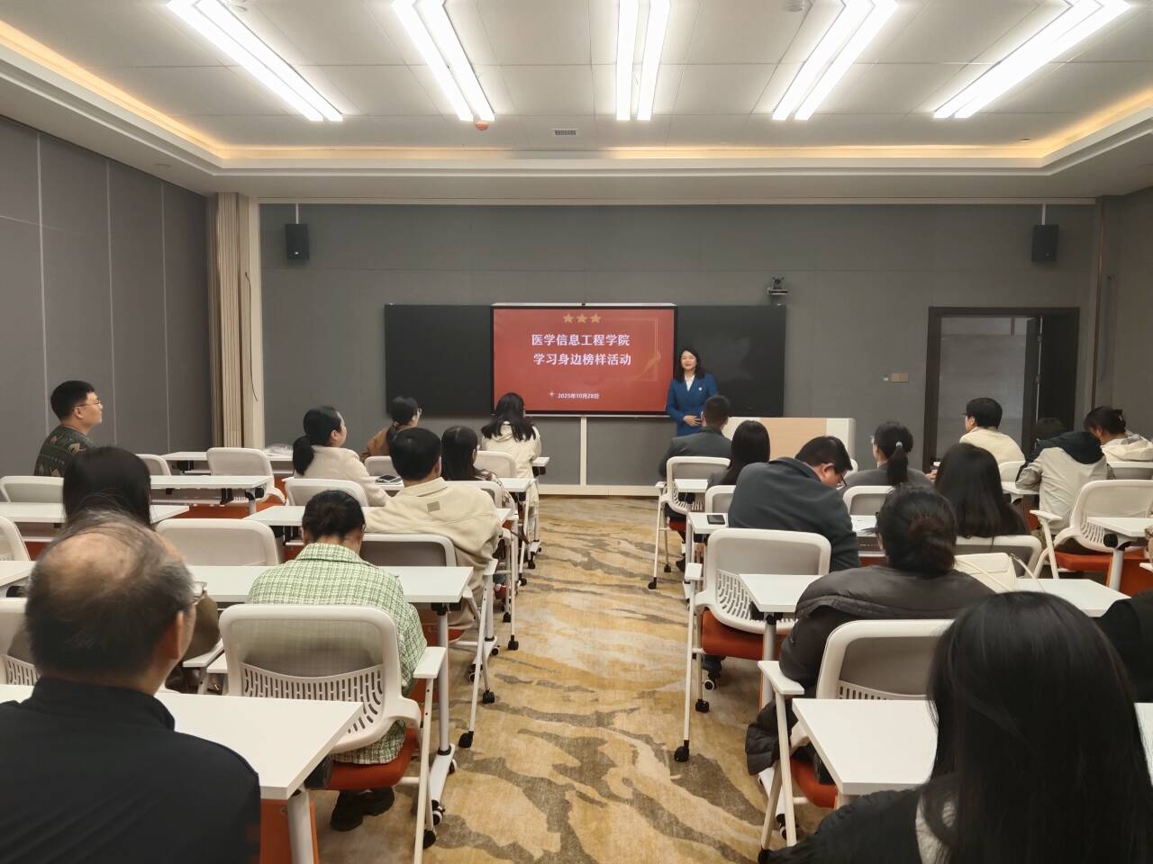 活动第二阶段:开展“学习身边榜样”专题活动,胡赟老师以“从学科竞赛到人才培养的实践路径”为题分享竞赛育人实践经验。胡赟老师结合自身指导学科竞赛的经验,分享了如何以竞赛为载体,锤炼学生实践能力、创新思维的具体做法,展现了基层教师立足岗位、深耕育人的责任担当,为支部党员提供了可借鉴的教学实践参考。