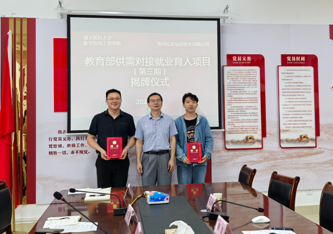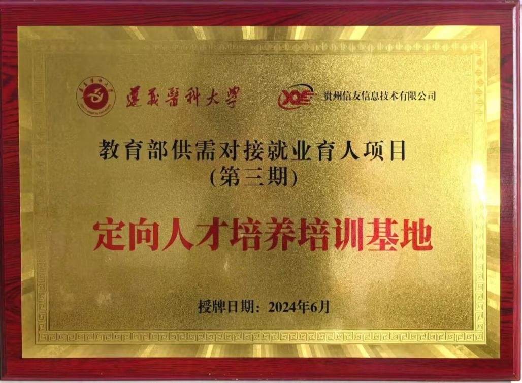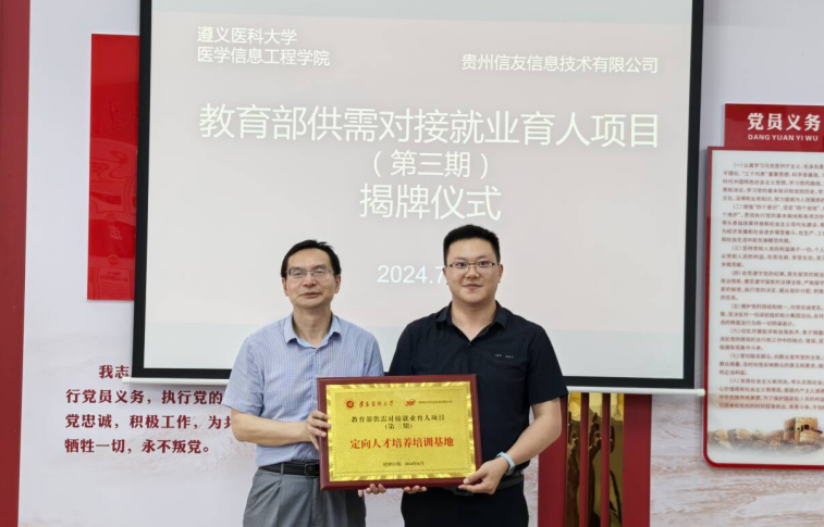 近日,学校招生就业处郎婕老师对接贵州信友信息技术公司的“教育部第三期供需对接就业育人项目”成功获批。7月1日,学院与公司就项目成功获批举行了座谈,共同为教育部第三期“定向人才培养培训基地”揭牌。学院院长王晓华、公司总经理周波、学院党委副书记刘畅、学院团委书记杨夏共同出席,项目负责人郎婕老师主持了会议。