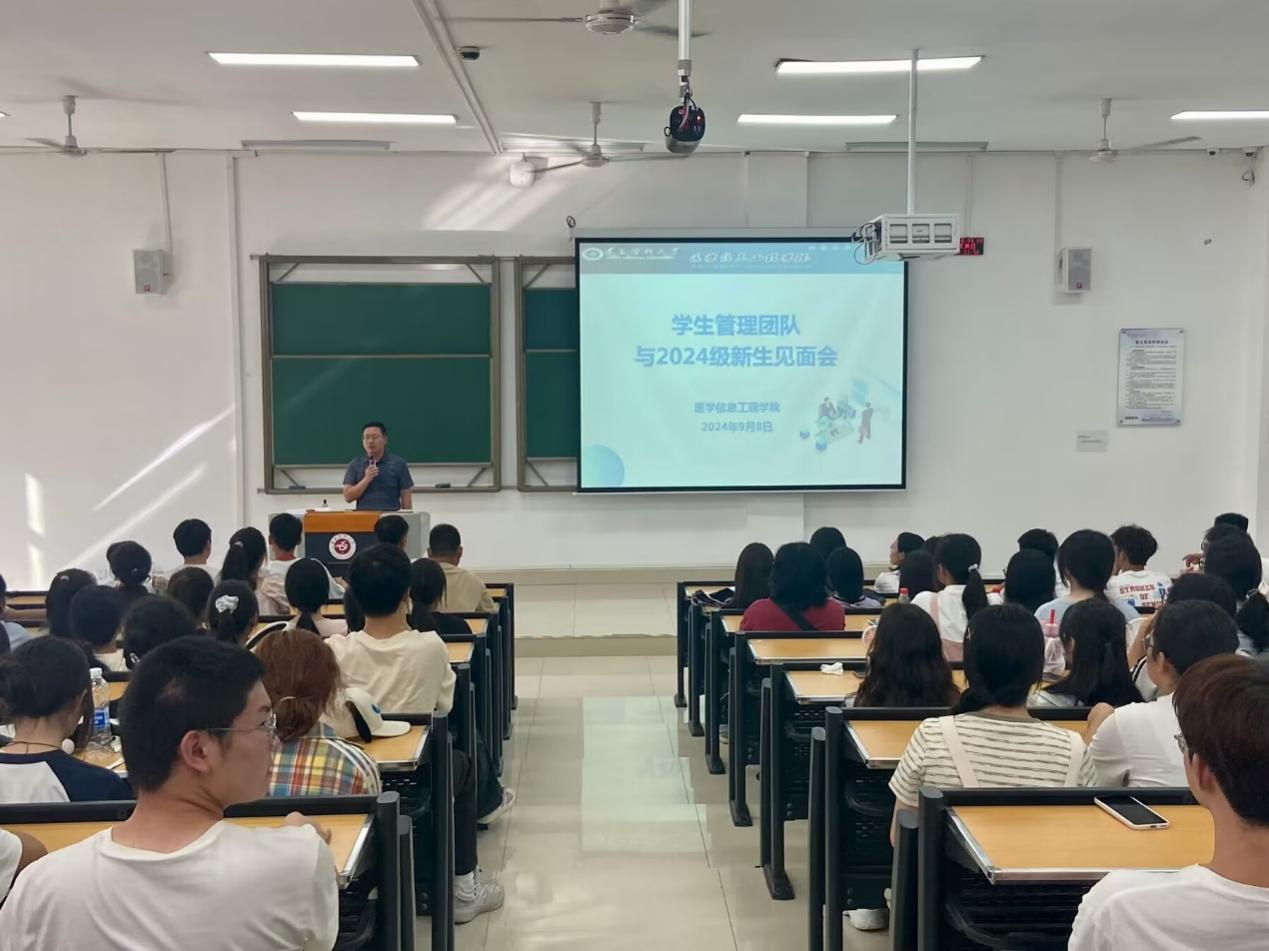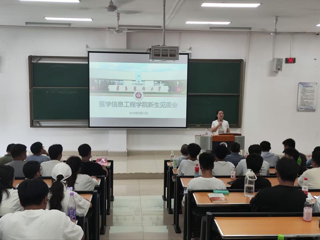 9月13日下午,学院召开了2024级新生见面会,见面会在庄严的国歌声中拉开序幕。会议由学院党委副书记刘畅主持,首先,她对到场的学院领导、教研室负责人、骨干教师进行了介绍。然后,学院党委书记李岩教授致欢迎词,他向同学们介绍了学校的历史,鼓励同学们奋发向上,不负韶华,厚植家国情怀,为实现学院高质量发展而不懈努力。再者,学院党委副书记、院长王晓华教授介绍学院的发展历程和学院的专业开设情况,他希望同学们能够好好学习专业知识,为祖国的医学信息化建设贡献力量。老生代表舒燕从朋辈的角度出发向新同学介绍了学校学习、生活方面的情况,新生代表代表全体新生进行了发言。最后,学院党委副书记刘畅对2024级新同学进行了新生适应性讲座,从大一到大四学习能力的培养、人际交往方面的锻炼、学业竞赛等方面进行了分析,并与同学们进行了交流。