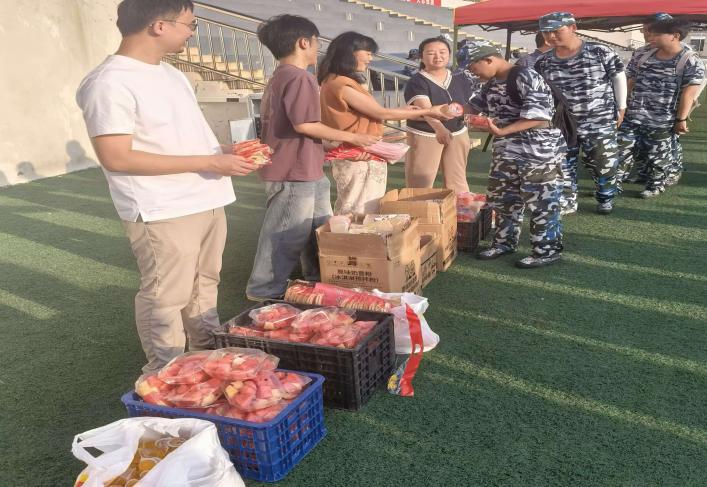 活动开始,在南区运动场,李岩书记对同学们在军训中表现出的坚韧不拔意志和积极乐观态度给予高度赞扬,他希望同学们在学习和生活中牢记“坚持、自律、珍惜”六个字,继续养成坚持不屈的品格,严格训练,培养吃苦耐劳、奋勇争先的精神,保持自律的生活作风,珍惜大学美好生活。在北区运动场,副书记刘畅指出军训是大学生活的第一课,既能锻炼身体素质,强身健体,也能增强纪律观念、团队协作意识,激发爱国主义责任感。同时提醒同学们注意安全,做好必要的防护,以更加饱满的精神状态圆满完成军训任务。接着,进行慰问物资发放,学院领导、老师和学生班导们将准备的饮品、水果、零食等丰富慰问品,逐一递到每位新生手中,并与新生亲切交流,询问军训感受和生活困难,进一步拉近了师生之间距离。