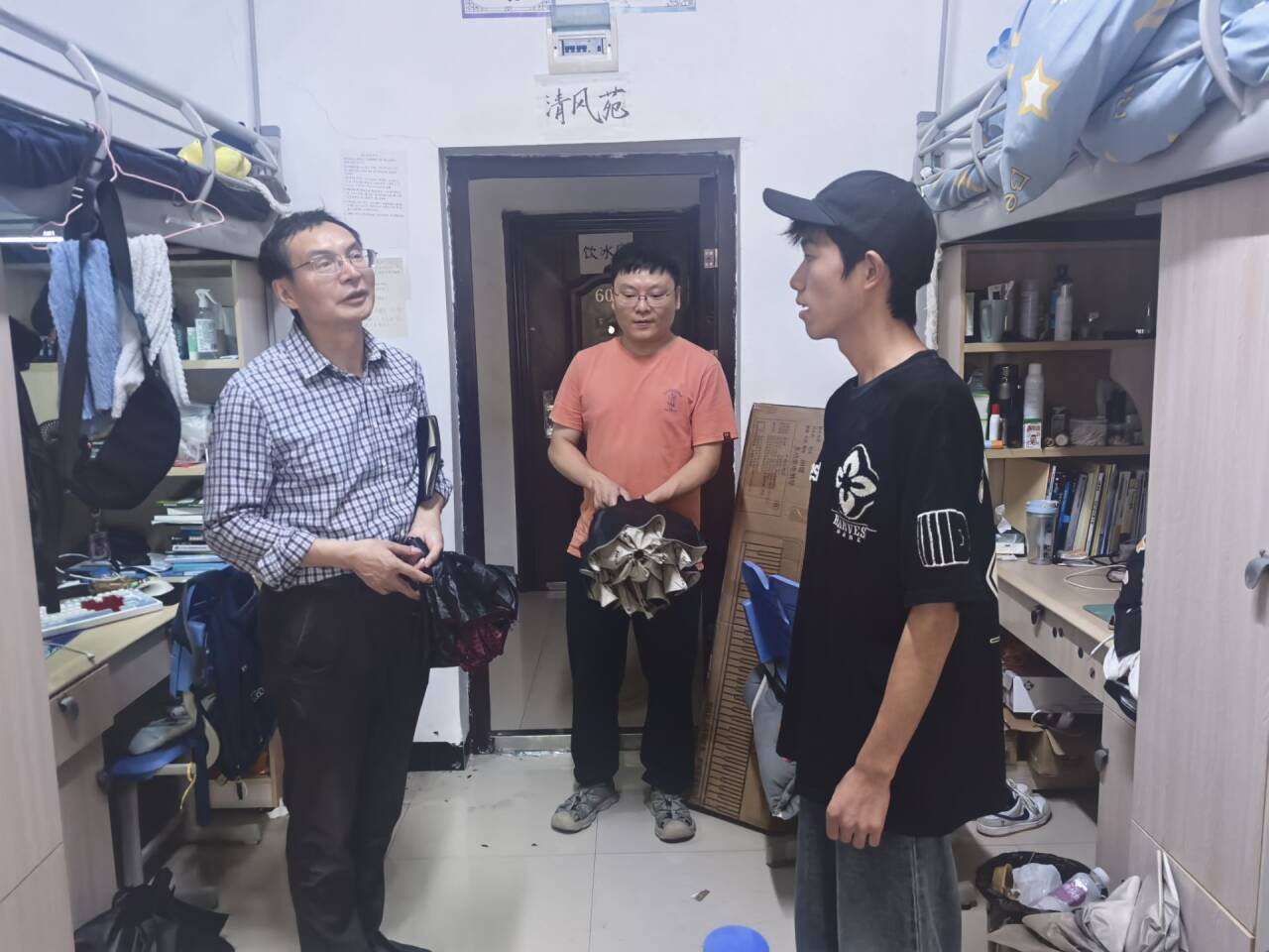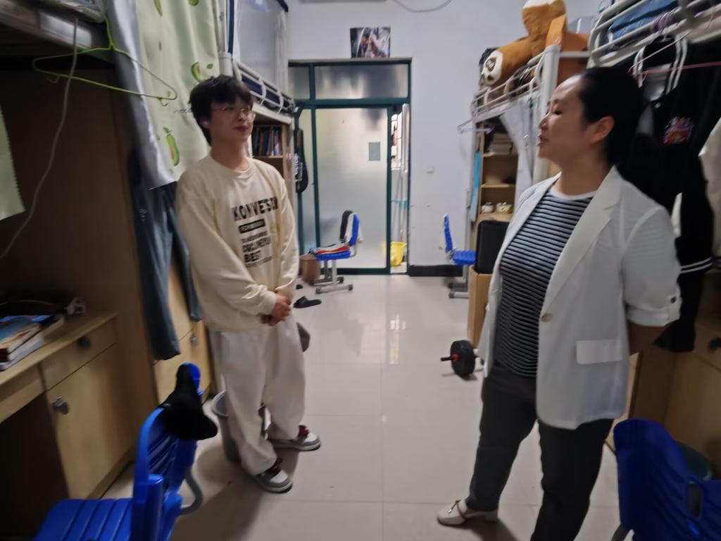 在学院考研动员座谈会结束后,学院领导、老师们一同前往学生寝室,实地关心学生生活,指导学生成长,叮嘱同学们要特别注意国庆假期中宿舍用电安全,关注学生们的心理状态和假期安排,鼓励他们利用假期时间充实自己,为新学期的学习和生活做好准备。