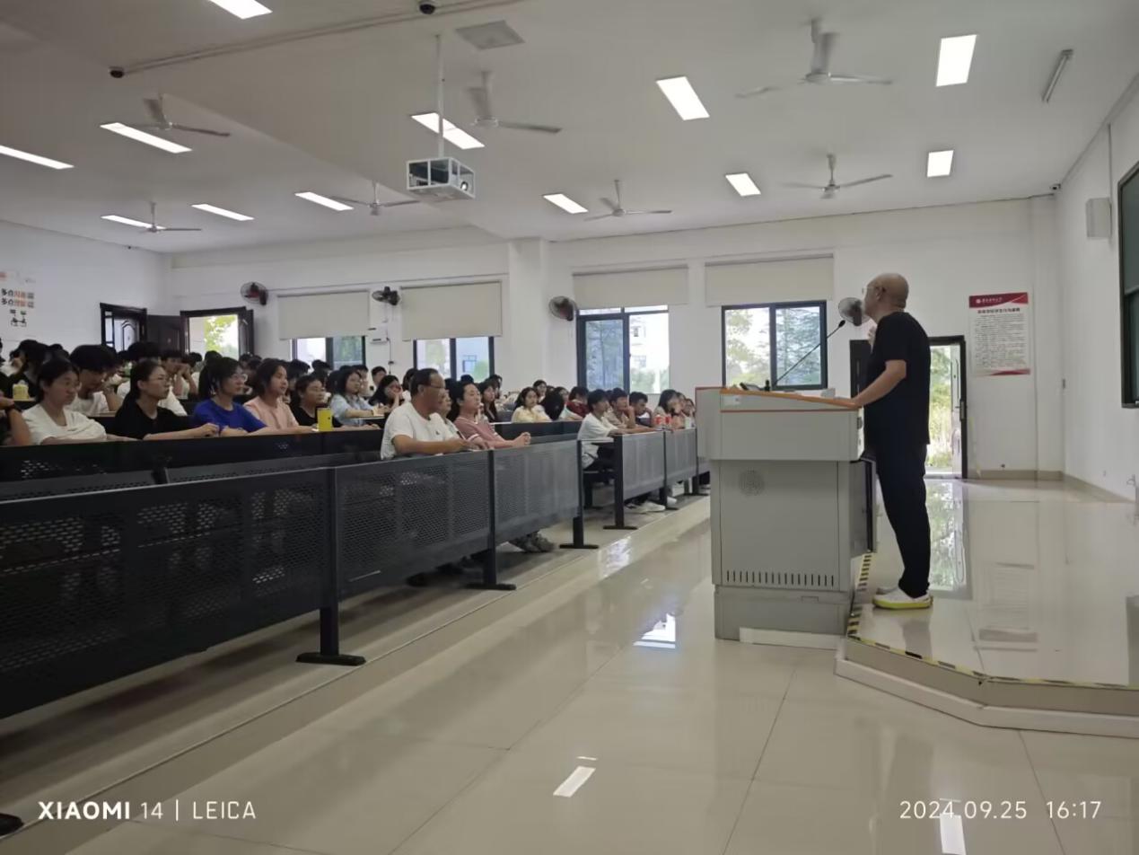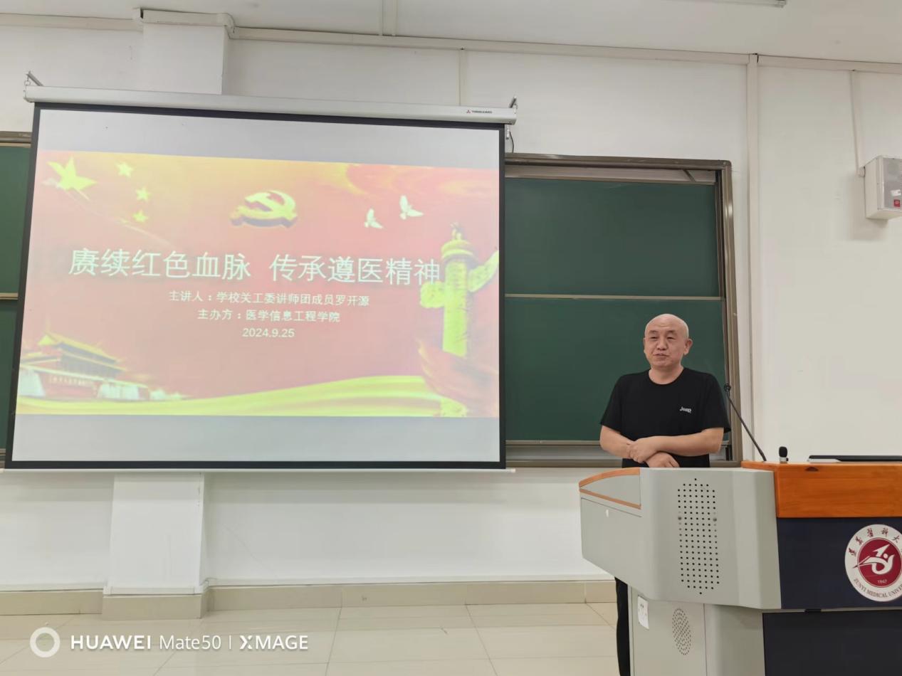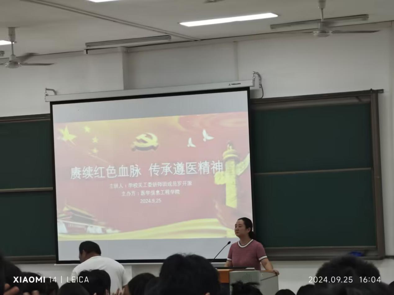 9月25日下午4时,bw必威西汉姆联在四号教学楼38阶梯教室,开展2024年迎新系列活动之“赓续红色血脉 传承遵医精神”入学教育专题讲座,学院党委书记李岩等院领导、无课教师、2024级全体无课学生参加。讲座由学院党委副书记刘畅同志主持,学校关工委讲师团成员罗开源同志主讲。